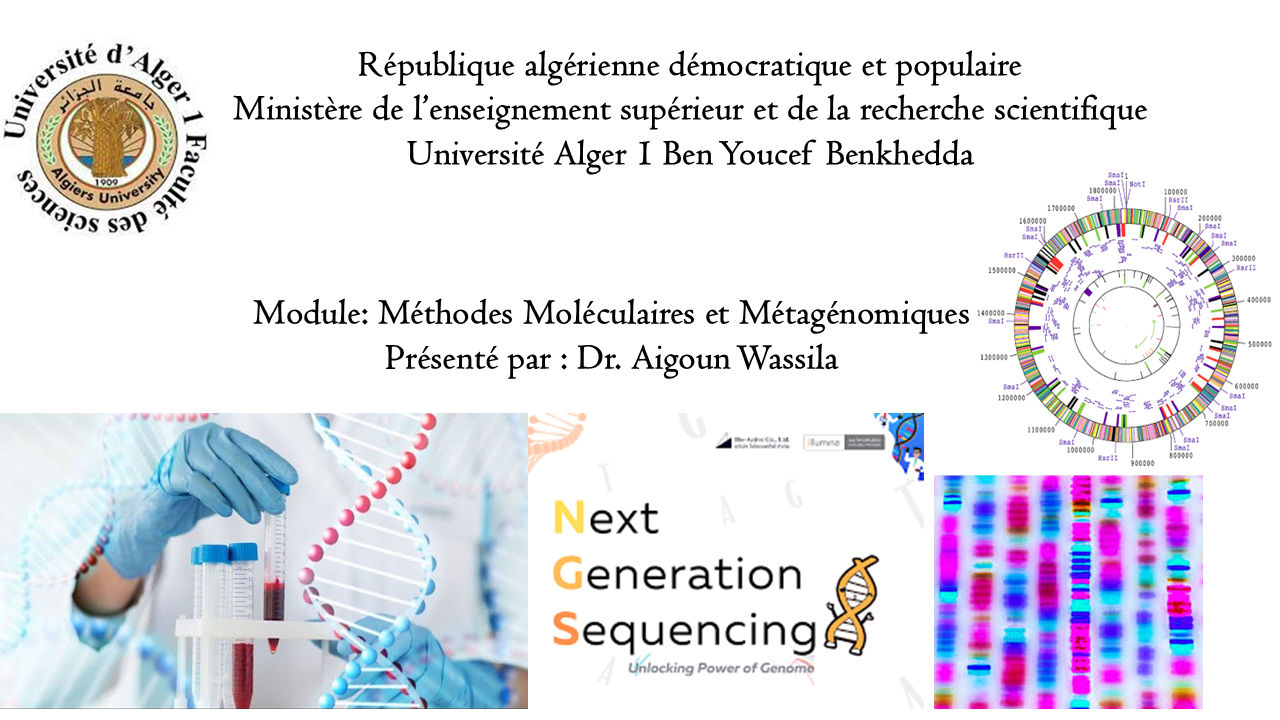Le cours intitulé « Méthodes Moléculaires et Métagénomiques » s’intéresse aux technologies de pointe et aux méthodes d’analyses utilisées en biologie moléculaire et dans le domaine de la métagénomique. Il Permet de s’approprier les principes, les concepts et les outils pour l’analyse des génomes. Il concerne les méthodes moléculaires et métagénomique, en particulier la génomique structurale et fonctionnelle, les marqueurs moléculaires et leur utilisation ainsi que l’expression des gènes du génome. Il s’intéresse aussi à la science des Omiques, leur principe, outils et méthodes d’analyses bio-informatique.